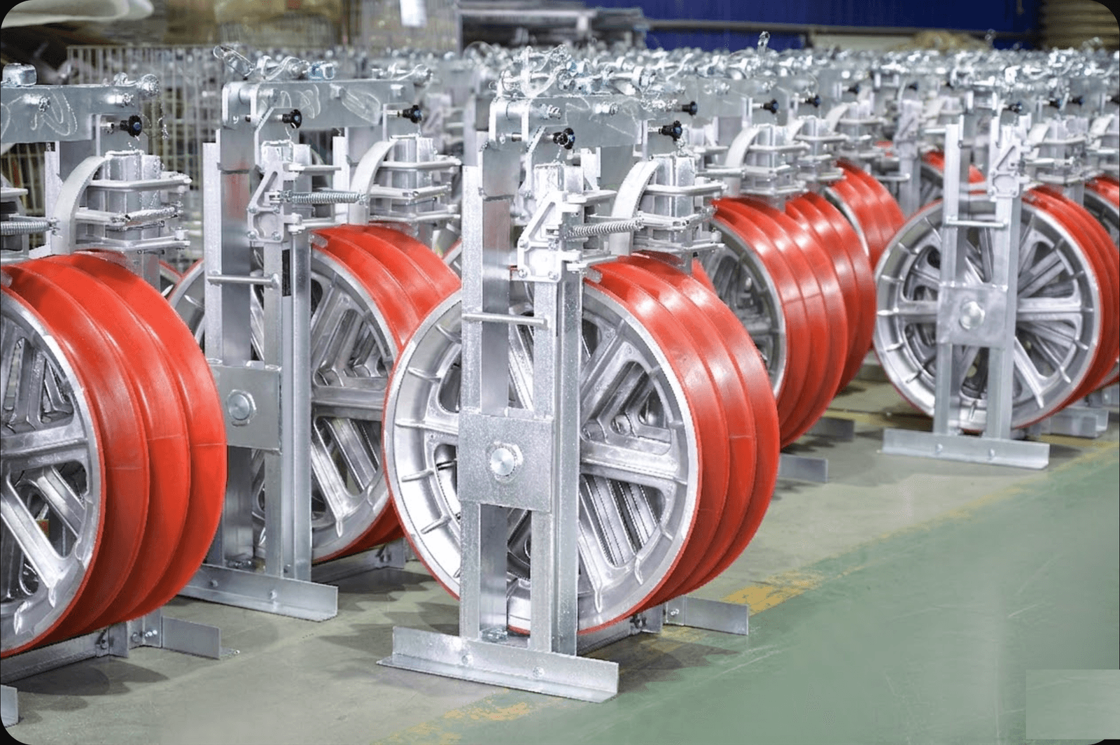 High-performance stringing blocks engineered for transmission line construction, including helicopter-assisted installation solutions.